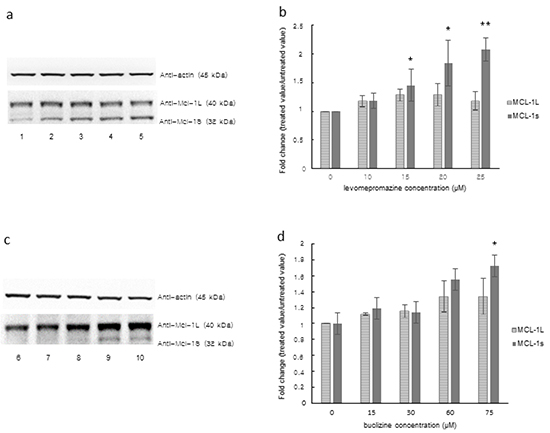 Ten milliliters of M-PER® Mammalian Protein Extraction Reagent (Thermo Scientific) were used after adding one tablet of Complete Mini Protease Inhibitor (Roche, Mannheim, Germany). MCF-7 cells were incubated at 6 well plates with treatment of levomepromazine or buclizine for 72 h. Afterwards, medium including drug or solvent was removed and 100 μL of prepared M-PER® Mammalian Protein Extraction Reagent (Thermo Scientific) including protease inhibitor were added to each plate. The plates were inverted for 5 min, then cells were harvested using a cell scraper and transferred to a 1.5 mL tube. The cell solution was shaked for 30 min at 4°C. After centrifugation (14000 × g, 15 min, 4°C), the supernatant was obtained and the protein concentration was determined using NanoDrop1000 (Thermo Scientific).