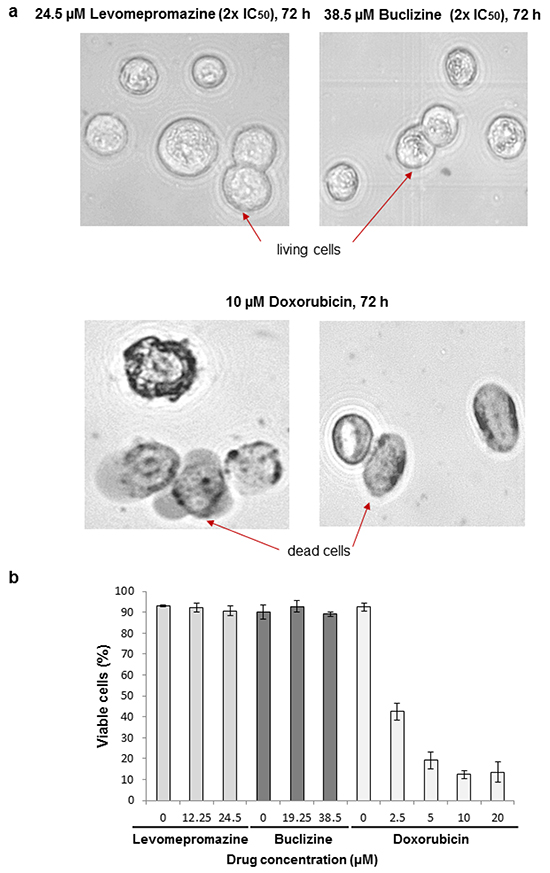 Resazurin reduction assay was used to investigate the effect of growth inhibition of levomepromazine and buclizine towards MCF-7 cells. The assay is based on reduction of the indicator dye, resazurin, to the highly fluorescent resazurin by viable cells. Non-viable cells rapidly lose the metabolic capacity to reduce resazurin and, thus, do not produce fluorescent signal. Briefly, adherent cells were detached by 0.25% trypsin/EDTA (Invitrogen, Darmstadt, Germany) and 5,000 cells were placed in each well of a 96-well cell culture plate (Thermo Scientific) in a total volume of 200 μL. Cells were attached overnight and then were treated with different concentrations of drugs. After 72 h incubation, 20 μL resazurin (Sigma-Aldrich, Taufkirchen, Germany) 0.01% w/v in ddH2O was added to each well and the plates were incubated at 37°C for 4 h. Fluorescence was measured by an Infinite M2000 Proplate reader (Tecan, Crailsheim, Germany) using an excitation wavelength of 544 nm and an emission wavelength of 590 nm. Each experiment was done at least three times, with six replicates each. The viability was analyzed based on a comparison with untreated cells. IC50 values indicate the drug concentrations required to inhibit 50% of cell proliferation and were calculated from a calibration curve by linear regression using Microsoft Excel.