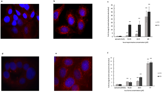 MCF-7 cells were seeded in each well of a sterile ibi Treat μ-slide (ibidi, Martinsried, Germany) and cells were allowed to attach overnight. Cells were treated with different concentrations of levomepromazine, buclizine or solvent (H2O or DMSO). Afterwards, cells were rinsed twice with PBS and fixed for 20 min with PBS containing 4% paraformaldehyde at 20°C. After another PBS rinse and staining for 15 minutes with 500 nM of Nile Red (Sigma-Aldrich, Taufkirchen, Germany) and 300 nM of 4′,6-diamidino-2-phenylindole (DAPI) (Life Technologies GmbH, Darmstadt, Germany), the cells were PBS washed and mounted. Fluorescence imaging was performed by using 531 nm excitation and 593 nm emission for Nile Red and 357 nm excitation and 447 nm emission for DAPI of EVOS digital inverted microscope (Life Technologies).