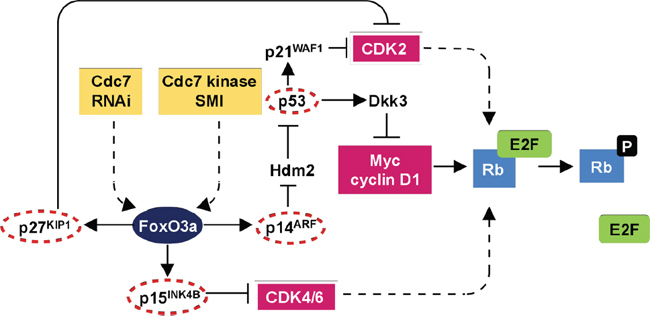 The interest in Cdc7 as a therapeutic target comes from the observation that depleting Cdc7 levels using siRNA, or alternatively inhibiting Cdc7 kinase activity in cancer cells, results in only limited numbers of replication forks being established during S phase, culminating in fork stalling and/or collapse followed by apoptotic cell death [19–22]. Intriguingly, the specificity of this approach relates to the fact that normal somatic cells avoid entering a lethal S phase under Cdc7 rate limiting conditions by engaging a DNA origin activation checkpoint response that reversibly arrests cells in G1 phase until Cdc7 levels are restored following removal of the Cdc7 targeting agent [19, 23]. Our studies and those of other groups have previously shown that this checkpoint is p53 dependent [19–21, 23]. More recently we have determined that this checkpoint is also dependent on a number of additional tumour suppressor genes commonly inactivated in solid tumours [23]. We have shown that this DNA checkpoint response is mediated via three signalling axes coordinated through the transcription factor FoxO3a (Figure 1). In arrested cells, FoxO3a activates the ARF-|Hdm2-|p53-p21 pathway and mediates p15INK4B upregulation; p53 in turn activates expression of the Wnt/b-catenin signalling antagonist Dkk3, leading to Myc and cyclin D1 downregulation. The resulting loss of CDK activity inactivates the Rb-E2F pathway and overrides the G1-S transcriptional programme. Notably we observed no redundancy in these checkpoint effector axes, meaning that any tumours harbouring inactivating mutations in any of the tumour suppressor genes namely p53, p21, Dkk3, ARF, Hdm2, FoxO3a, p15, p27 and Rb are susceptible to Cdc7 targeting agents. Taken together these findings indicate that targeting Cdc7 constitutes a synthetic lethality driven approach in tumour backgrounds harbouring commonly mutated tumour suppressor genes.