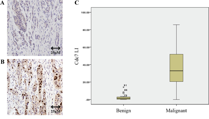 Figure 2: Immunohistochemistry of benign A. and malignant B. pancreatic tissue showing Cdc7 staining. C. Box and whisker plot showing that the Cdc7 labelling index (LI) in patients with pancreatic cancer was significantly higher than in those who had resections for benign disease (P<0.0001).