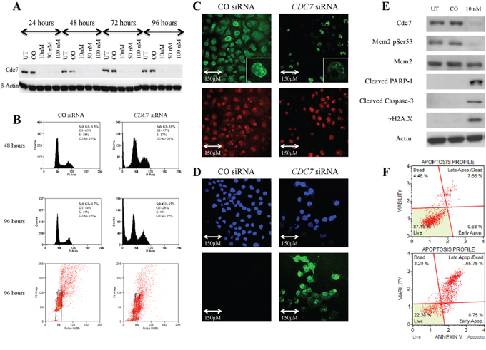 Figure 3: Knockdown of CDC7 mRNA in PANC-1 pancreatic adenocarcinoma cells following transfection with custom siRNA. A. Western blot showing Cdc7 protein expression levels following transfection with different concentrations of CDC7 siRNA (10, 50 and 100 nM) along with untreated (UT) and non-coding siRNA (CO). There was evidence of reduced protein expression at each concentration and at each time point. β-Actin loading control is shown below. B. Flow cytometry showing that at 48 hours, there was no enrichment of PANC-1 cells in the G1 population following treatment with 10 nM CDC7 siRNA, and cells started to accumulate in a sub G1 peak. At 96 hours this effect was more pronounced with evident cell death, as represented by the sub G1 peak of 45% and plot of distribution including examples of gating. C. BrdU staining (green) in cells treated with 10 nM CDC7 siRNA and CO siRNA. A much smaller proportion of the CDC7 siRNA cells stained positive, indicating reduced synthesis of new DNA. PI staining (red) is shown as a control. D. There was avid TUNEL staining (green) of 10 nM CDC7 siRNA treated cells indicating apoptosis. DAPI staining (blue) is shown as a control. E. Western blot showing protein levels at 96 hours following Cdc7 depletion with 10 nM siRNA in the PANC-1 pancreatic adenocarcinoma cell line. There was reduced expression of Cdc7 protein and also loss of Cdc7 target phosphorylation of Mcm2 at Ser53. There was evidence of activation of the classical apoptotic pathway with cleavage of PARP-1 and Caspase-3. Phosphorylated γH2A.X was seen after Cdc7 depletion suggesting double strand DNA breaks. F. Annexin V staining confirmed apoptosis (early and late) in 8% of CO siRNA treated cells (upper graph), compared with 75% of the 10 nM CDC7 siRNA treated cells (lower graph).