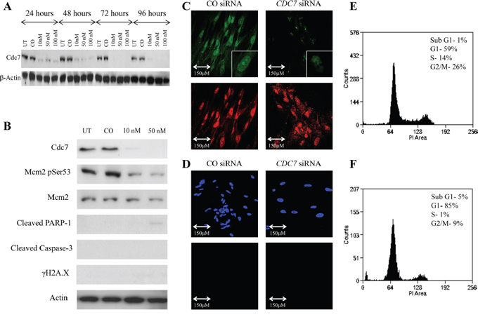Figure 5: Knockdown of CDC7 mRNA in IMR90 fibroblast cells following transfection with custom siRNA. A. Western blot showing Cdc7 protein expression levels following transfection with different concentrations of CDC7 siRNA (10, 50 and 100 nM) along with untreated (UT) and non-coding siRNA (CO). There was evidence of reduced protein expression at each concentration and at each time point. β-Actin loading control is shown below. B. Western blot showing protein levels at 96 hours following Cdc7 depletion in the IMR90 fibroblast cell line. There was reduced expression of Cdc7 protein and also loss of Cdc7 target phosphorylation of Mcm2 at Ser53. In contrast to the changes seen in the cancer cells, there was no evidence of activation of the classical apoptotic pathway with no staining for cleaved PARP-1, Caspase-3 or γH2A.X. C. BrdU assay demonstrated reduced staining of the CDC7 siRNA treated cells (top images, green) when compared with propidium iodide (bottom images, red), whereas the control siRNA cells stained for both BrdU and PI. These findings indicate reduced synthesis of new DNA when the cells were treated with CDC7 siRNA. D. TUNEL assay showed no evidence of TUNEL labelling in CO siRNA or CDC7 siRNA treated cells (DAPI top, blue; TUNEL bottom, green). This assay was performed at the same time and under the same conditions as CDC7 siRNA treatments of PANC-1 and CAPAN-1 cells, which served as the positive control. On FACS analysis, treatment of IMR-90 fibroblasts with CDC7 siRNA F. induced an accumulation of cells in the G1 population, compared to CO siRNA treated cells E. (85% vs. 59%). There was a minimal sub-G1 peak (5% vs. 1%) seen. These findings suggest that Cdc7 depletion causing a G1 arrest in IMR90 cells.