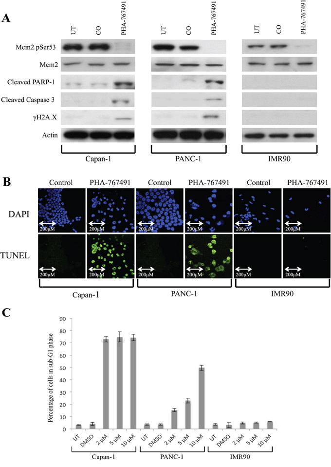 Figure 6: Effect of treatment with PHA-767491 on Capan-1, PANC-1 and IMR90 cell lines. A. Western blot showing protein levels at 96 hours following Cdc7/Cdk9 inhibition in each cell line. There was loss of Cdc7 target phosphorylation of Mcm2 at Ser53 in all lines. There was evidence of activation of the classical apoptotic pathway with cleavage of PARP-1 and Caspase-3 in the pancreatic cancer lines, but not in IMR90. Furthermore, in the cancer lines, phosphorylated γH2A.X was seen after treatment with the inhibitor suggesting double strand breaks in DNA, but not in IMR90. β-Actin loading control is shown below for each cell line. B. TUNEL staining (green) was strongly positive in the Capan-1 (2 μM PHA-767491) and PANC-1 (10 μM PHA-767491) cells but absent in the IMR90 treated cells (2 μM PHA-767491). DAPI staining (blue) is shown as a control. C. The proportion of cells in sub-G1 phase after 96 hours is shown on a bar chart for each cell line. Capan-1 shows high levels of sub-G1 accumulation at all dosages but in the PANC-1 line, there appeared to be a clear dose-dependent increase in the percentage of cells accumulating in the sub G1 peak (2 μM-15%, 5 μM- 22%, 10 μM- 49%) versus the DMSO and untreated controls.