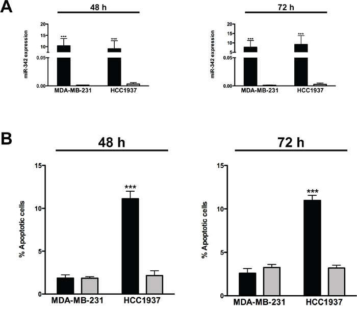 Figure 1: miR-342 overexpression induces apoptosis in BRCA1-mutant breast cancer cells. MDA-MB-231 and HCC1937 cells were transfected with pre-miR-342 (black) or pre-miR-negative control (grey) and collected 48 and 72 hours later. A. qRT-PCR data showing the expression levels of mature miR-342 in breast cancer cells after transfection. Data are expressed as 2–ΔCt (delta cycle threshold), which is directly related to the miRNA expression levels in each sample, and represent mean ± SD from three independent determinations. ***P<0.001 vs scramble. B. Quantification of data obtained by TUNEL assay upon miR-342 overexpression. Data are mean ± SD from three independent determinations. ***P<0.001 vs scramble.