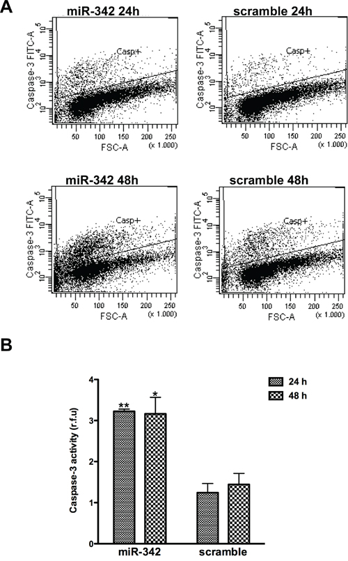 Figure 2: miR-342 overexpression activates the intrinsic pathway of apoptosis in HCC1937 cells. HCC1937 cells transfected with pre-miR-342 or with pre-miR-negative control were collected 24 and 48 hours after transfection. A. Representative flow cytometric detection of cells containing active caspase-3 from three independent experiments. B. Caspase-3 catalytic activity, based on hydrolysis of a specific fluorogenic substrate. Data are given as relative fluorescence units (r.f.u.) and represent mean ± SD from three independent determinations. *P<0.05 and **P<0.01 vs scramble.
