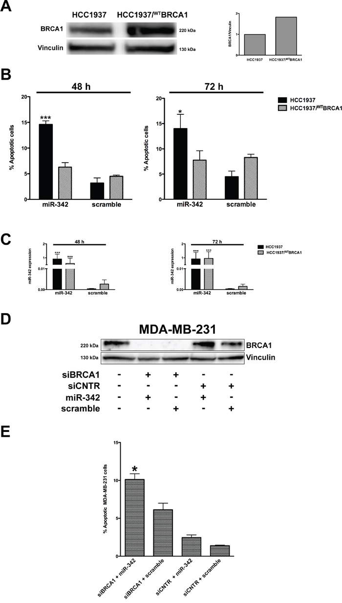 Overall, our data show that miR-342 expression synergizes with the loss of functional BRCA1 in promoting apoptosis in HCC1937 TNBC cells, identifying miR-342 reconstitution as a promising avenue to therapy in patients with BRCA1-mutant hereditary BCa.