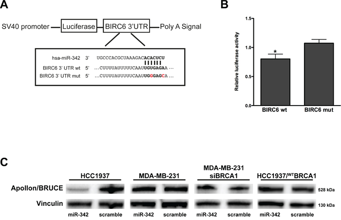 Figure 4: miR-342 targets BIRC6 and down-modulates Apollon/BRUCE protein in HCC1937 cells. A. Schematic representation of the interaction of miR-342 at nucleotides 204-210 of the wild-type (wt) and mutated (mut) BIRC6 3’ UTR cloned into pGL3 promoter vectors (pLuc–BIRC6 and pLuc-MUT-BIRC6). B. Quantification of relative luciferase activity (RLU) in 293T cells upon transfection with pre-miR-342 or scramble. Data are given as the ratio between luciferase activity detected in pre-miR-342 vs scramble-transfected cells and represent mean ± SD from at least three independent determinations. *P<0.05. C. Representative Western blot from three independent experiments showing Apollon/BRUCE protein expression after transfection of pre-miR-342 or of a scramble in HCC1937, MDA-MB-231, MDA-MB-231 siRNA BRCA1, and HCC1937/WTBRCA1 cells. Vinculin was used as loading control.
