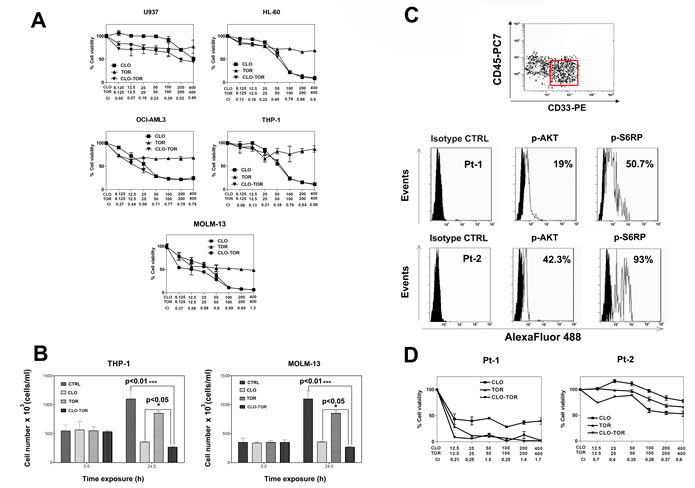 AML primary cells were then treated with the drugs, and cell viability was analyzed by MTT assays. A marked reduction in cell viability at 96 h was detected (Fig.1D). In Fig.1D it is shown a patient who was very sensible to CLO-TOR and a patient more resistant to the treatment, but in whom nevertheless the CLO-TOR combination displayed a strong synergism, with CIs < 0.4. Of the 12 analyzed patients, 8 were sensitive whereas 4 displayed various degree of resistance to the drug combination. Overall, these findings demonstrated that the CLO-TOR combination has a synergistic cytotoxic activity also against primary cells from AML patients with up-regulated PI3K/Akt/mTOR signaling.