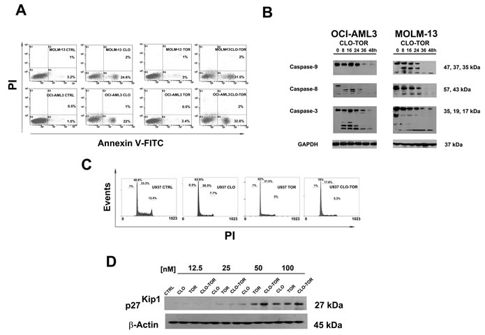Figure 2: CLO-TOR induces apoptosis and cell cycle arrest in the G0/G1 phase of cell cycle. A: Flow cytometric analysis of Annexin V-FITC/PI stained AML cell lines treated for 8 h with 100 nM clofarabine (CLO), 100 nM temsirolimus (TOR), or the CLO-TOR combination (100 nM + 100 nM). The percentages of early apoptotic cells (Annexin-V FITC+/PI-, lower right quadrant) and late apoptotic/necrotic cells (Annexin-V FITC+/PI+, upper right quadrant) are indicated. The histograms are representative of three separate experiments. CTRL: untreated cells. B: Western blot analysis documenting the activation of caspase-8, caspase-9, and -3 by CLO-TOR (100 nM + 100 nM). Cells were treated with CLO-TOR for the indicated times, collected, and then lysed. Fifty micrograms of each lysate were electrophoresed on SDS-PAGE gels, followed by transfer to nitrocellulose membranes. An antibody to GAPDH demonstrated equal lane loading. Molecular weights are indicated at right. C: Flow cytometric analysis of PI-stained U937 cells after 24 h of treatment with clofarabine (CLO, 100 nM), temsirolimus (TOR, 100 nM), or the CLO-TOR combination (100 nM + 100 nM). One representative of three separate experiments is shown. D: Western blot analysis documenting concentration-dependent, increased expression of p27Kip1 in U937 cells treated with the drugs for 24 h. An antibody to β-actin demonstrated equal lane loading. Molecular weights are indicated at right. CTRL, untreated cells; CLO, clofarabine; TOR, temsirolimus.