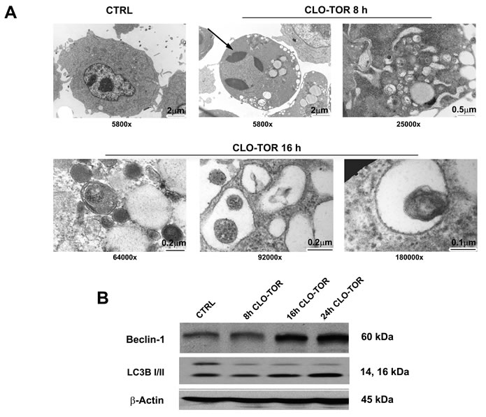 Figure 3: CLO-TOR induces autophagy in MOLM-13 cells. A: Cells were treated for the indicated times with CLO-TOR (100 nM + 100 nM), then processed for TEM analysis that documented both autophagy and apoptosis induction. Large cytoplasmic vacuoles containing various degraded organelles are evident, as well as condensed apoptotic chromatin (arrow). The original magnification of the micrographs is indicated. B: Western blot analysis for Beclin-1 and LC3B I/II expression in MOLM-13 cells treated with CLO-TOR (100 nM + 100 nM) for the indicated times. An antibody to β-actin demonstrated equal lane loading. Molecular weights are indicated at right. In A and B, CTRL, untreated cells.
