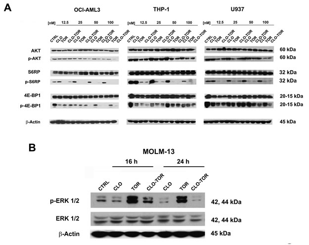 Figure 4: CLO-TOR affects the phosphorylation state of critical components of the PI3K/Akt/mTOR signaling pathway, as well as p-ERK 1/2 levels in AML cell lines. A: Cells were treated with clofarabine (CLO), temsirolimus (TOR), or the drug combination (CLO-TOR) at the indicated concentrations for 24 h, collected, and lysed. Western blot analysis was then performed. B: Western blot analysis documenting changes in p-ERK 1/2 levels in MOLM-13 cells treated with the single drugs (100 nM) or CLO-TOR (100 nM + 100 nM) for the indicated times. In A and B, 50 µg of each lysate were electrophoresed on SDS-PAGE gels, then blotted to nitrocellulose membranes. An antibody to β-actin demonstrated equal lane loading. Molecular weights are indicated at right. In A and B, CTRL, untreated cells.