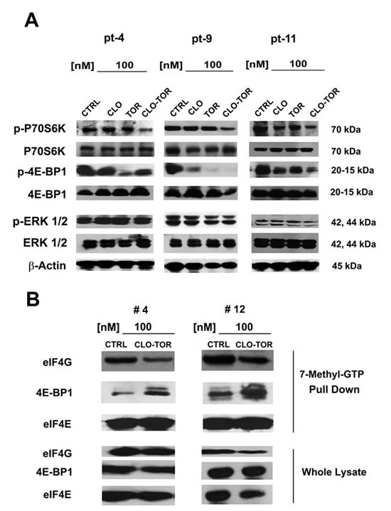 Translation of mRNA is tightly regulated at the initiation level through the assembly of eIF4F complexes. The phosphorylation of 4E-BP1 is the limiting step in the assembly of the translation initiating complex eIF4F, initiated by the interactions between the eIF4E and eIF4G proteins [28, 29]. It has been documented that rapamycin and rapalogs were not effective at blocking the formation of the eIF4F complex in acute leukemia cells, owing to incomplete dephosphorylation of 4E-BP1 [30, 31]. We thus performed 7-methyl-GTP pull-down assays in patient samples treated with CLO-TOR to study the interactions between eIF4E and eIF4G (active translation) or 4E-BP1 (inactive translation). CLO-TOR decreased the amount of eIF4G associated with eIF4E, whereas the amount of 4E-BP1 associated with eIF4E increased, thus switching translation to an inactive state (Fig. 6B). Western blots analysis performed on whole-cell lysates documented that the drug combination did not significantly reduce eIF4G, eIF4E, or 4E-BP1 expression.