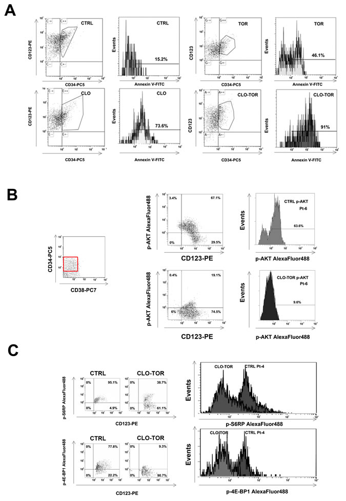 We have also documented that CLO-TOR treatment caused apoptosis in the CD34+/CD38-/CD123+ cell subset that is enriched in LICs. Importantly, the combined treatment was more effective than either drug alone in inducing apoptotic cell death in this subpopulation. Moreover, CLO-TOR was able to down-regulate the phosphorylation of Akt at Ser 473 and of S6RP at Ser 235/236, implying targeting of both mTORC1 and mTORC2 in the CD34+/CD38-/CD 123+ subset.