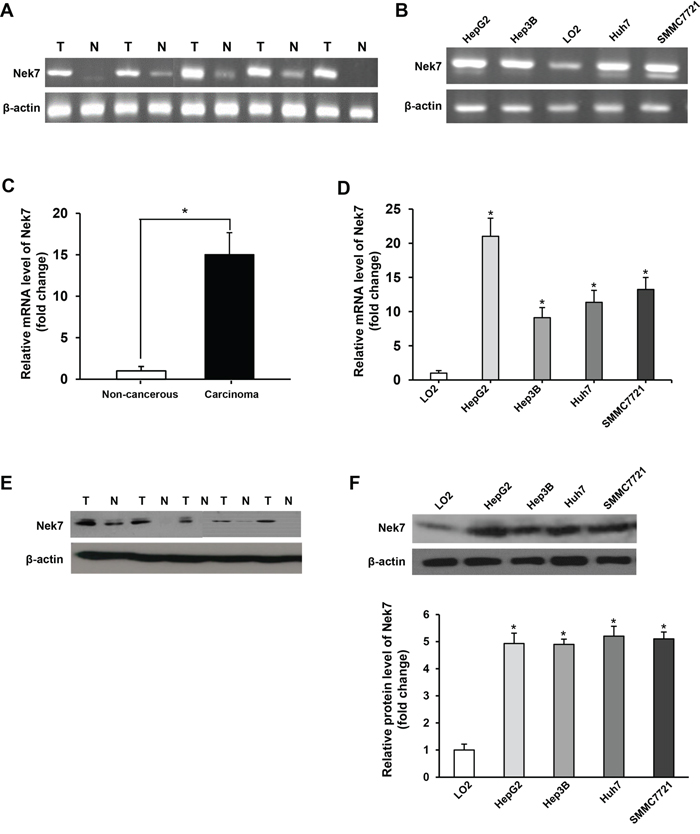 Figure 1: The results of Nek7 mRNA and protein expression in tissue specimens and cell lines. A. Semi-quantitative RT-PCR analysis of Nek7 mRNA expression in HCC specimens (T) and normal liver tissues (N). B. Semi-quantitative RT-PCR analysis of Nek7 mRNA expression in HCC cell lines (HepG2, HuH7, Hep3B and SMMC7721) and a normal hepatic cell line (LO2). C. Real-time PCR analysis of Nek7 expression in HCC specimens (T) and normal liver tissues (N). D. Real-time PCR analysis of Nek7 expression in HCC cell lines and normal hepatic cell line LO2. E. Western blot analysis of Nek7 protein expression in representative HCC (T) and normal liver tissues (N). F. Western blot analysis of Nek7 protein expression in four HCC cell lines and a normal hepatic cell line (LO2). β-actin was used as internal control for RT-PCR and Western blot. Experiments were done in triplicate. (*p < 0.05).