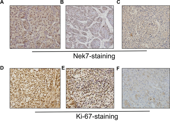 Figure 2: Immunohistochemistry of Nek7 and Ki-67 on HCC specimens. Representative immunohistochemical staining of HCC specimens with different histologic grade, as determined using anti-Nek7 and anti-Ki-67 antibodies. A. The expression status of Nek7 in low-grade HCC tissue. B. An example of moderate-differentiated HCC with Nek7 expression. C. Nek7 expression in high-grade HCC tissue. D. Ki-67 expression status in low-grade HCC tissue. E. Example of moderate-differentiated HCC with Ki-67 expression. F. Ki-67 expression in high-grade HCC tissue.