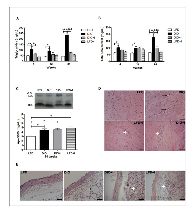 The risk of developing cardiovascular alterations was assessed by determining plasma triglycerides (TG) and total cholesterol (TC) levels together with a lipoprotein electrophoretic analysis. The highest levels of TG and TC were demonstrated in DIO group at 24 weeks compared to LFD and DIO+I groups. Interestingly, although DIO+I improved dyslipidemia compared to DIO group (24 weeks), plasmatic apoB100 levels were significantly increased in all groups compared to LFD, suggesting the presence of pro-atherogenic small and dense LDL particles (Figure 2A-2C).