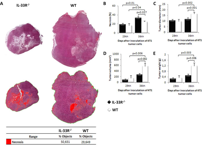 In order to investigate the role of IL-33/IL-33R axis in tumor necrosis we used 4T1 metastatic breast cancer model in IL-33R-deficient BALB/c mice. Mice were sacrificed on days 29 or 36 after tumor inoculation. We first investigated the extent of necrosis in primary mammary tumors at days 29 and 36. As shown in Figure 1A and 1B the extent of tumor necrosis appear to be higher in IL-33R-/- mice with statistically significant larger extent of necrosis on day 36 after tumor challenge (p = 0.027; Figure 1B). In order to compare the degree of tumor necrosis with other parameters of tumor expansion, we measured tumor diameter, volume and weight. These parameters were evaluated on day 36 and indicated significantly faster tumor growth in WT mice which had less extensive tumor necrosis (all p < 0.01; Figure 1C, 1D and 1E).