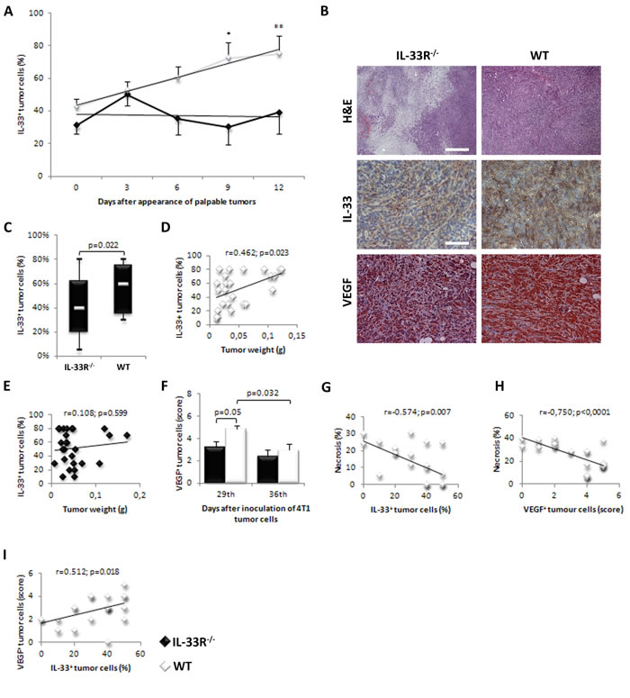 Figure 2: IL-33 and VEGF expression in mammary carcinoma is lower in IL-33R deficient mice. A. IL-33 expression in mammary tumor cells significantly increased over time in WT mice (*p = 0.019, **p = 0.003). B. H&E staining (original magnifications: x100, scale bar: 200μm) and immunohistochemical expression of IL-33 (Upper panel) and VEGF (Lower panel) (original magnifications: x200, scale bar: 100μm) in tumor tissue in IL-33R-/- and WT mice, representative tissue sections. C. Percentage of cytoplasmic expression of IL-33 and difference in percentage of cytoplasmic expression of IL-33 in tumor cells between IL-33R-/- and WT mice. D. Correlation between tumor weight and IL-33 expression in tumor cells in WT and IL-33R-/- mice. E., F. Expression of VEGF in tumor tissue at 29th and 36th day after inoculation of 4T1 cells in IL-33R-/- and WT mice. G. Correlation between the extent of tumor necrosis and IL-33 expression in tumor cells in WT mice. H. Correlation between the extent of tumor necrosis and VEGF expression in tumor cells in WT mice. I. Correlation between expression of VEGF and IL-33 in tumors in WT mice. Statistical significance was tested by Mann-Whitney Rank Sum test and by Spearman correlation coefficient.