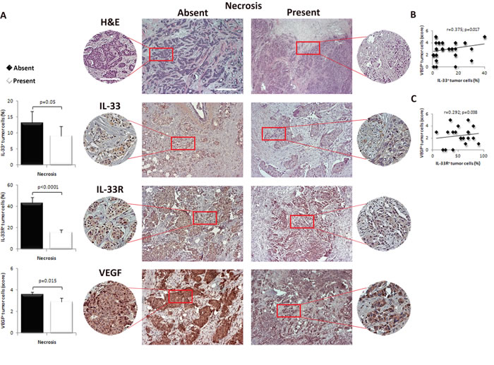 Figure 3: IL-33, IL-33R and VEGF expression in human breast carcinoma with present or absent tumor necrosis. A. Representative images of human mammary carcinoma with and without necrosis (H&E, original magnification: x100, scale bar: 200μm; x200, scale bar: 100μm). IL-33, IL-33R and VEGF expression was evaluated by immunohistochemistry for each patient (original magnification: x100, scale bar: 200μm; x200, scale bar: 100μm). The difference in the expression of immunohistochemical markers was examined between tumors with and without necrosis. B., C. Correlation between IL-33 and IL-33R with VEGF expression in tumor cells in human mammary carcinoma tissues. Statistical significance was tested by Mann-Whitney Rank Sum test, independent samples t-test or Spearman correlation coefficient.