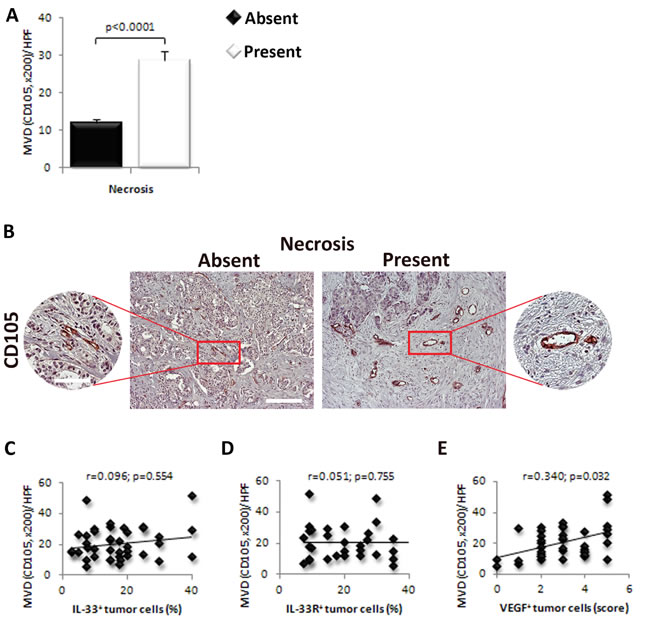 The MVD was higher in tumors with necrosis in comparison to those without necrotic fields (p < 0.0001; Figure 4A and 4B). Blood vessels were grouped in clusters in tumor tissues mainly around the necrotic zone (Figure 4A and 4B). Next, we analyzed the association of IL-33, IL-33R and VEGF expression with MVD in perinecrotic breast cancer tissue. We did not find significant correlation between the expression of IL-33 (r = 0.096; p = 0.554) and IL-33R (r = 0.051; p = 0.755) in perinecrotic zone and MVD in tumor tissue Figure 4C and 4D). However, there was statistically significant positive correlation between the expression of VEGF in tumor cells around the necrotic zone and MVD (r = 0.340; p = 0.032; Figure 4E).