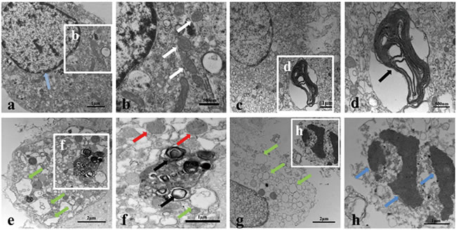 Figure 1: PrP106-126 induces pathological - structural changes in primary cultured cortical neurons (PCCN). a.-h. Transmission electron microscopy reveals morphological changes of organelles in PCCN exposed to PrP106-126 for 24h. Negative control neurons are treated with PBS showed normal mitochondria (white arrow) and nucleus ultrastructure (light blue arrows) (a, b). PrP106-126-treated neurons (c-h) shows various sizes of myelin figures (black arrows) (c, d); mitochondrial swelling (red arrows)(f); a large number of vacuoles or swollen and disorganized smooth endoplasmic reticulum (green arrows) (e-g); nuclear fragmentation and nuclear condensation (blue arrows)(h).