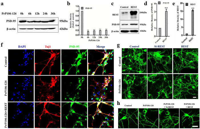 Figure 3: REST protects PCCN from PrP106-126 induced synaptic damage and neurofibrillary degeneration. a., b. Immunoblotting shows that PrP106-126 decreased the expression of the postsynaptic marker, PSD-95 in PCCN. PSD-95 level is expressed as ratio to the 0 h value. c., d., e. Immunoblotting analyses of PSD-95 and REST in PCCN transfected with HA-vector or REST-vector. REST and PSD-95 level are expressed as ratio of REST-transfected to the HA-vector transfected neurons. All data are represented as mean±SD of triplicate experiments and the values are normalized to the expression of β-actin. **P < 0.01 versus untreated cells (b) or cells transfected with HA-vector. f. Immunofluorescence microscopy shows that overexpression of REST restores the expression of PSD-95 in PCCN exposed to PrP106-126. Scale bars = 40μm. g. Overexpression of REST alleviates PrP106-126-induced neurofibrillary degeneration in PCCN. Knockdown of REST (Si-REST) exacerbates neuritic degeneration induced by PrP106-126. PCCN are incubated with PrP106-126 for 24 h. Neuritic processes are labelled with antibody Tuj1 (green). Scale bars = 20μm. h. Larger magnification of confocal photomicrographs in (g) to clearly show neuronal morphology. Scale bars = 10μm.