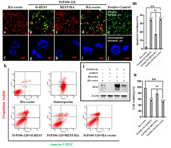 Flow cytometric analysis using the Annexin V-FITC/PI apoptosis detection kit provided quantitative data on PrP106-126-induced apoptosis of PCCN. Compared with the siRNA-transfected (55.2% viability) and HA-vector (50.8%) groups, REST-overexpression significantly increased cell viability (77.5%) (Figure 4k and 4n). Including the early and late stage of apoptosis, apoptosis of PrP106-126-treated PCCN was significantly decreased after transfection with REST (17.2%), relative to the si-REST (34.0%) and HA-vector (34.5%) groups (Figure 4k and 4m).