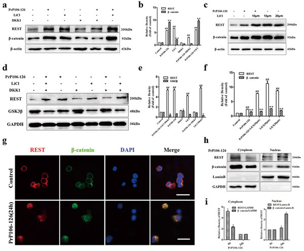 PCCN was incubated with PrP106-126 (300 μm) for 24h. β-Catenin in parallel with REST increased significantly in the prion peptide-treated cells, compared with the negative control (Figure 7a, 7b). The GSK3-β inhibitor, lithium chloride (LiCl) activated Wnt signaling induced-β-catenin as well as REST (Figure 7a-7c and 7f). Treatment with both PrP106-126 and LiCl enhanced the increase of β-catenin and REST compared with the negative control. By contrast, induction of REST and β-catenin was partially inhibited by the Wnt signalling antagonist, Dickkopf (DKK1) (Figure 7a and 7b). In concert with our hypothesis, immunoblotting showed a significant inverse relationship between REST and GSK3-β after the neruronal cells were incubated with PrP106-126, LiCl or DKK1 as indicated (Figure 7d and 7e). Furthermore, immunofluorescence (Figure 7g) and immunoblotting data (Figure 7g-7i) demonstrated that REST translocated from cytoplasm to nucleus in PCCN after stimulated by PrP106-126 and colocalized with β-catenin. These results indicate that Wnt-β-catenin signaling may contribute to the induction of REST in PrP106-126-induced neuronal death.