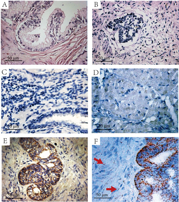 Figure 2: The H&E and immunohistochemistry staining of HIF-lα in the intra-acinar and peri-acinar of BPH tissues. A. H&E staining of the peri-acinar of BPH tissues. B. H&E staining of the intra-acinar of BPH tissues. C. Immunohistochemistry staining with HIF-lα antibody in peri-acinar of BPH tissues, which is negative in HIF-lα expression. D. Immunohistochemistry staining with HIF-lα antibody in intra-acinar of BPH tissues, the graph shows weak-positive expression. E. Immunohistochemistry staining with HIF-lα antibody in intra-acinar of BPH tissues, the graph shows moderate-positive expression. F. Immunohistochemistry staining with HIF-lα antibody in intra-acinar of BPH tissues, the graph shows HIF-lα expression in mesenchymal cells (Red Arrow).