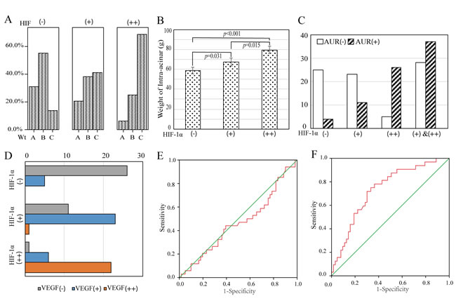 Figure 4: The correlation between HIF-lα expression and clinical variables of BPH patients. A. BPH cases were classified into three groups according to levels of HIF-lα expression. B. The difference of intra-acinar Wt is statistically different when grouped by HIF-lα expression. C. The proportion of patients with AUR history is increased with the elevation of HIF-lα expression. D. The expression of VEGF in BPH intra-acinar tissues is correlated with HIF-lα. E. The receiver operating characteristic(ROC) curve was plotted using weak-positive expressing HIF-lα as status variables and intra-acinar weight of prostate as independent variable. F. The ROC curve was plotted using moderate-positive expressing HIF-lα as status variables.