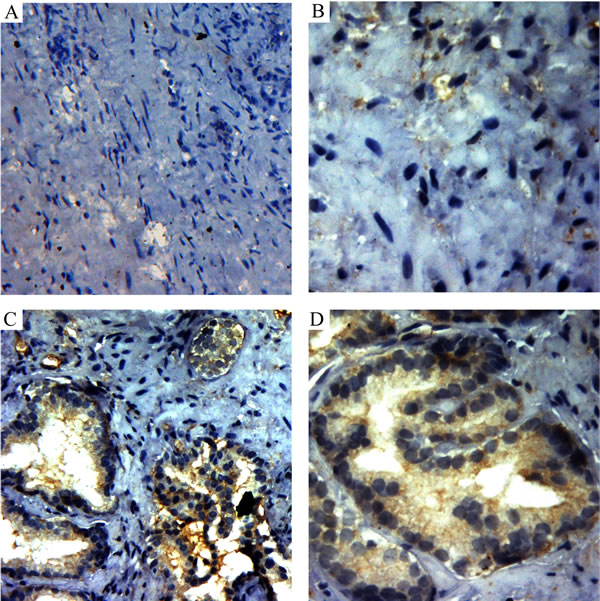 Figure 5: Immunohistochemistry staining of VEGF in the intra-acinar and peri-acinar of BPH tissues. A. Immunohistochemistry staining with VEGF antibody in peri-acinar of BPH tissues, which is negative in HIF-lα expression(200X). B. Immunohistochemistry staining with VEGF antibody in peri-acinar of BPH tissues(400X). C. Immunohistochemistry staining with VEGF antibody in intra-acinar of BPH tissues (200X). D. Immunohistochemistry staining with VEGF antibody in intra-acinar of BPH tissues(400X).