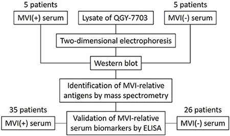 Figure 2: Schema of screening and validation of serum biomarkers for MVI. The lysate of QGY-7703 is separated by two-dimensional electrophoresis followed by immunoblotting with the serum from 5 MVI (+) HCC patients or 5 MVI (−) HCC patients, respectively. The protein entities of spots that are either specifically associated with MVI (+) patients or with MVI (−) patients are identified by mass spectrometry. ELISA is performed to validate the presence of antibodies in the sera from 35 MVI (+) and 26 MVI (−) HCC patients that recognize MVI associated antigens.