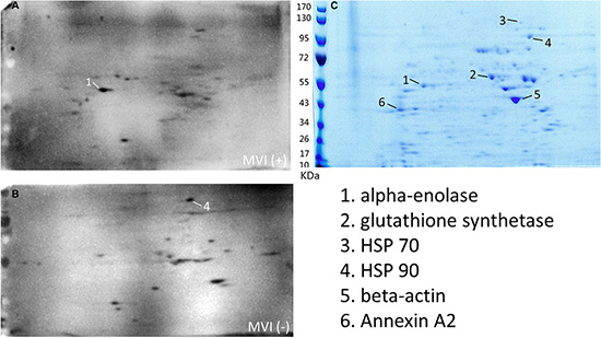 We thus attempted to identify the autoantibodies and their antigens associated with the status of MVI by following the sero-proteomic study schema described in Figure 2. The cell lysate from the QGY-7703 HCC cell line was subjected to two-dimensional electrophoresis (2DE). The 2DE gels were blotted by 5 MVI (+) sera and 5 MVI (−) sera, respectively. By comparing these blots, we identified that 2 spots were specifically recognized by MVI (−) sera and 4 spots were specifically recognized by MVI (+) sera, respectively. These spots were then analyzed by mass spectrometry (MS) for their protein identities. These six proteins are Eno-1, HSP 70, HSP 90, glutathione synthetase, beta-actin and Annexin A2 (Figure 3).