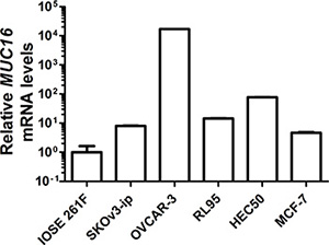 Figure 1: Basal MUC16 mRNA levels in various epithelial cell types. MUC16 mRNA levels were measured via quantitative qRT-PCR relative to the mRNA levels for ACTB in the indicated cell lines as described in Materials and Methods. IOSE 261F is the cell line with the lowest basal MUC16 mRNA levels and its value was arbitrarily set to 1 for comparison. Although error bars are not evident in all cases, triplicate independent determinations were performed in each case with variation < 5% among samples. In order to express all values on the same graph due to the very high basal levels of MUC16 expressed by OVCAR-3 cells a log base 10 scale was used for the Y-axis.
