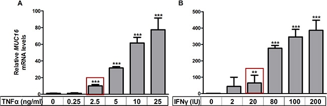 Figure 2: TNFα and IFNγ stimulate MUC16 mRNA levels in a dose dependent manner. MCF-7 cells were treated with the indicated concentrations of TNFα (panel A) or IFNγ (panel B) for 48 h, RNA extracted and the levels of MUC16 mRNA relative to those of ACTB were determined by qRT-PCR as described in Materials and Methods. The boxes indicate the lowest concentrations of either cytokine that demonstrated a significant stimulation of MUC16 mRNA levels and were used in subsequent experiments to determine the potential synergy of action between these cytokines. Values for the vehicle controls were arbitrarily set to 1 in each case. Bars and error bars indicate the means +/− SD for triplicate determinations in each case. **p < 0.01 vs. vehicle; ***p < 0.001 vs. vehicle.