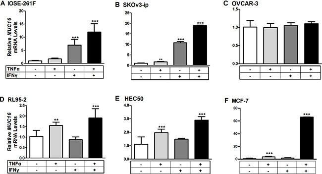 Figure 3: Cytokine treatments stimulate MUC16 mRNA levels in various cellular contexts. Each indicated cell line was treated for 48 h with either a vehicle control (0.1% [w/v] BSA in PBS), TNFα (2.5 ng/ml), IFNγ (20 IU), or a combination of TNFα + IFNγ. RNA then was extracted and the levels of MUC16 mRNA relative to that of ACTB was determined by qRT-PCR as described in Materials and Methods. Values obtained for vehicle controls in each case were set to 1 for comparison. The bars and error bars indicate the mean ± SD of triplicate independent determinations in each case. ***p < 0.001, **p < 0.01 vehicle vs. IFNγ, TNFα or TNFα + IFNγ. Panels: (A) IOSE261F; (B) SKOv3-ip; (C) OVCAR-3; (D) RL95-2; (E) HEC50 and; (F) MCF-7.