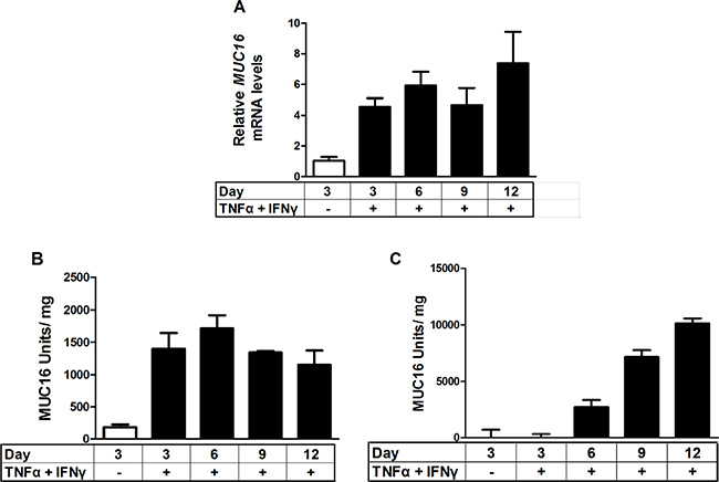 Figure 4: Time course of stimulation of MUC16 mRNA levels and protein production in response to combined cytokine treatment. MCF-7 cells were treated either with vehicle (0.1% [w/v] BSA in PBS) or TNFα (2.5 ng/ml) plus IFNγ (20 IU) for the indicated times. MUC16 mRNA levels were determined by qRT-PCR and amounts of cell-associated and secreted/shed MUC16 were determined by CA 125 ELISA assays as described in Materials and Methods. The bars and error bars indicate the mean ± SD of triplicate independent determinations in each case. Panels: (A) mRNA levels; (B) cell associated MUC16; (C) media MUC16.