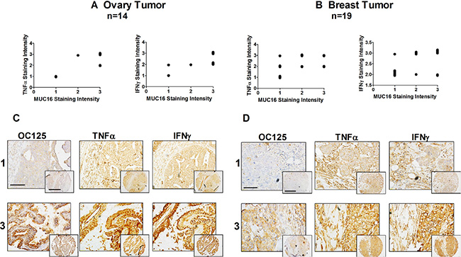 Figure 6: MUC16, TNFα, and IFNγ are co-expressed in malignant ovarian and uterine neoplasms. Tissue staining and staining intensity assessments were performed as described in Materials and Methods. A correlation between the intensity of MUC16 staining and TNFα and IFNγ staining was observed in ovarian cancer (A) and to a lesser degree in breast cancer (B). Cytokine staining intensity was plotted against the staining intensity for MUC16 in each case and a correlation analysis was performed. Ovarian cancer TNFα vs MUC16: Correlation coefficient (r) = 0.8016. r squared = 0.6426, The P value is 0.0006, considered extremely significant and IFNγ vs MUC16: Correlation coefficient (r) = 0.7077. r squared = 0.5009, the P value is 0.0046, considered very significant. Breast cancer, TNFα vs MUC16: Correlation coefficient (r) = 0.4771. r squared = 0.2276, the P value is 0.0389, considered significant and IFNγ vs MUC16: Correlation coefficient (r) = 0.7705. r squared = 0.593, the P value is 0.0001, considered extremely significant. Data was plotted with a small variation to help visualization. Representative tissue microarray images show different combinations of MUC16, TNFα and IFNγ expression in different uterine neoplasms. (C) Representative staining of ovarian cancers scored as 1 or 3 for MUC16, TNFα and IFNγ with staining in both the cancer and stroma. Lower magnification, scale bars: 25 μm. Higher magnification (inset), scale bars: 10 μm. (D) Representative staining of breast cancers scored as 1 or 3 for MUC16, TNFα and IFNγ. Lower magnification, scale bars: 25 μm. Higher magnification (inset), scale bars: 10 μm.