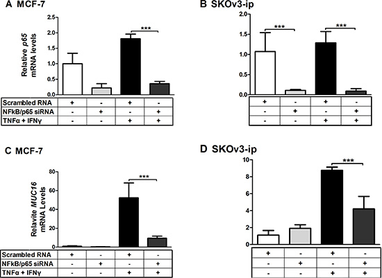 Figure 7: MUC16 mRNA responsiveness to cytokines is attenuated when NFκB/p65 is knocked down by siRNA. MCF-7 (A, C) and SKOv3-ip (B, D) cells were treated for 24 h with either scrambled or NFκB siRNA at a final concentration of 50 nM. Cells then were treated for 24 h with either a vehicle control (0.1% [w/v] BSA in PBS), or a combination of TNFα (2.5 ng/ml) plus IFNγ (20 IU). RNA then was extracted and the levels of NFκB/p65 (A and B) and MUC16 (C and D) mRNA relative to that of ACTB were determined by qRT-PCR as described in Materials and Methods. Values obtained for scrambled vehicle control in each case were set to 1 for comparison. The bars and error bars indicate the mean ± SD of triplicate independent determinations in each case. ***p < 0.001.