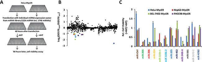 Figure 1: Functional screening identifies miRs that specifically inhibit the growth of Myc overexpressing cells. (A) Screening procedure. HeLa cells stably expressing MycER were transfected with individual miR expression vectors from the miR library, cultured in the absence or presence of 4-OHT to activate MycER and cell viability was determined. (B) Results of the high-content functional library screening for miRs specifically inhibiting growth of Myc overexpressing cells. miR-206 is indicated in red. (C) The effects of selective miRs inhibiting growth of several Myc overexpressing cells. The experiments were performed following the protocol described in (A). Data are means ± SD.