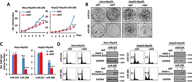 Figure 2: Overexpression of miR-206 is synthetically lethal with Myc overexpression. (A–C) Over-expression of miR-206 inhibits growth, focus formation and anchorage-independent soft agar growth of Myc over-expressing cells. (D) Over-expression of miR-206 promotes apoptosis of Myc overexpressing cells. Hela-MycER and HepG2-MycER cells stably transfected with control or miR-206 expression vectors were used to construct growth curves to assess focus formation and anchorage-independentsoft agar growth. Apoptosis was quantified by calculating the SubG1 DNA content and PARP-1 expression. Results are presented as means ± SD. *P < 0.05, **P < 0.01, ***P < 0.001.
