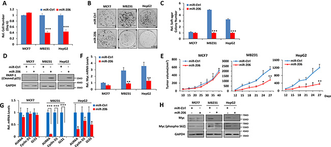Figure 3: miR-206 impairs growth, clonogenicity and tumorigenicity of cancer cells expressing high levels of Myc. (A–C) miR-206 inhibits growth, focus formation and anchorage-independent soft agar growth of Myc-over-expressing human cancer cells. (D) Over-expression of miR-206 promotes apoptosis of Myc-over-expressing human cancer cells. MCF-7, MB231 and HepG2 cancer cells stably expressing miR-206 or a control miR were used as described above for growth curves, focus formation, anchorage-independent soft agar growth and apoptosis detection. (E) Over-expression of miR-206 impairs tumorigenicity of Myc-over-expressing human cancer cells. The above cells were inoculated into nude mice. Tumor growth was monitered over time. (F) miR-206 decreases Myc mRNA levels of Myc-over-expressing human cancer cells. (G) miR-206 decreases Myc transcription activity of Myc-over-expressing human cancer cells. mRNA levels for the indicated Myc target genes were detected by qRT-PCR. (H) miR-206 affects stabilization of Myc protein of Myc-over-expressing human cancer cells. Cell extracts above cells were assayed by immuno-blotting using antibodies against the indicated proteins. Results are means ± SD. *P < 0.05, **P < 0.01, ***P < 0.001.