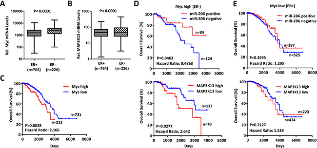 Datasets for breast cancer were downloaded from the Cancer Genome Atlas (TCGA) data portal (http://tcga-data.nci.nih.gov) [38–40]. Myc, MAP3K13 and miR-206 expression data were assessed and Kaplan Meier curves were calculated in human breast cancer tissues from the TCGA mRNA or miR-seq data set (n = 1044). For MAP3K13, patients within the top 1/3 and bottom 2/3 of the distribution were then assigned as having high and low gene expression, respectively. For Myc, patients with ER- and ER+ were then assigned as having high and low gene expression, respectively. For miR-206, patients with any detectable signal or no signal were then assigned as having positive and negative gene expression, respectively. Significance of individual genes within the high (or positive) and low (or negative) expression groups was calculated using a two-sided t-test.