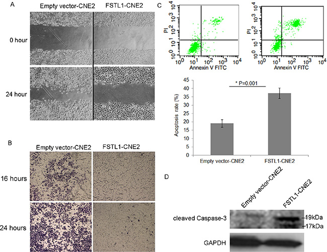 Figure 4: FSTL1 impedes cell migration, invasion and induces apoptosis of CNE2 cells. (A) Wound healing assay of the migration of CNE2 cells in response to FSTL1. Pictures were taken at the time 0 and 24 h under microscope. Magnification: 40×. (B) Transwell assay of the effect of FSTL1 on invasion capacity of CNE2 cells at 16 and 24 h. Magnification, 40×. (C) Flow cytometry analysis of the effect of FSTL1 on apoptosis and quantification. Cells positively stained with Annexin V-FITC alone (early apoptosis) or Annexin V-FITC and PI (late apoptosis) were considered apoptotic cells. Data are mean ± SD, n = 3. (D) Western blot assay of cleaved caspase-3 protein level in FSTL1-transfected CNE2 cells. GAPDH was an internal control.