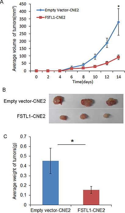 Figure 5: Exogenously expressed FSTL1 suppresses the tumorigenecity of CNE2 in vivo. Balb/c athymic nude mice were inoculated with 2 × 106 cells. (A) Growth curve of tumors in nude mice. Tumor volume was monitored every 2 days after inoculation. Data are mean ± SD (n = 8 for each group). *P < 0.05. (B) Tumors were removed from nude mice at day 14 after inoculation; representative data are shown. (C) Weight of tumors. Data are mean ± SD (n = 8). *P < 0.05.