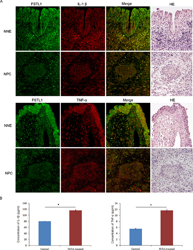 Figure 7: Decreased expression of FSTL1 associated with reduced IL-1β and TNF-α expression in NPC primary tumors. (A) Human normal nasopharyngeal epithelium tissues (NNE) and NPC tumor tissues were double immunofluorescence stained with FSTL1 (green) and TNF-α (red) or IL-1β (red) antibodies. H & E staining demonstrates the histomorphological characteristic of sections. Magnification, 200×. (B) ELISA of IL-1β and TNF-α secretion after treatment of human macrophages with soluble FSTL1 (0.75 μg/ml). Mock treatment was a control. Data are mean ± SD (n = 3). *P < 0.05.