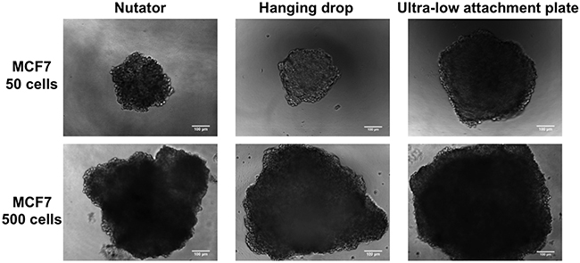 Figure 1: Phase contrast micrographs of MCF7 spheroids at Day 7 generated on hanging drop array plates, ultra-low attachment plates and ultra-low attachment plates with a 48 hour nutation period. Visually, spheroids generated from 500 cells were bigger in size than spheroids generated from 50 cells. Sizes of spheroids within the same cell density also varied depending on the method of manufacture. Scale bar = 100μm.