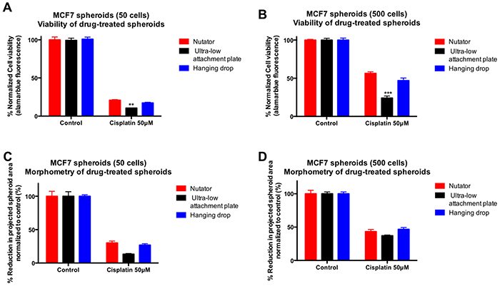 MCF7 spheroids generated on ultra-low attachment plates with or without nutation, and spheroids generated on hanging drop array plates were treated with 50μM cisplatin. Viability was determined using alamarblue fluorescence, and normalized to control untreated spheroids. Cisplatin-sensitivity of spheroids varied depending on the method of spheroid generation. Spheroids generated on hanging drop array plates and nutator plates were significantly more chemoresistant to cisplatin (Figure 3A, 3B) compared to spheroids generated on ultra-low attachment plates. Reduction in projected area of spheroids was quantified as a percentage change of drug-treated spheroids compared to untreated control spheroids. Cisplatin-treated spheroids generated on hanging drop array plates or nutator plates demonstrated a 26-30% (50 cells/drop) or 43-46% (500 cells/drop) reduction in projected area compared to 13.27% (50 cells/drop) or 37.17% (500 cells/drop) observed in ultra-low attachment plate generated spheroids (Figure 3C, 3D). Cisplatin treatment of MCF7 spheroids on the ultra low attachment plate resulted in significantly lower cell viability in both 50 cells/drop and 500 cells/drop spheroids (**p<0.001 for 50 cells/drop and ***p<0.0001 for 50 cells/drop, one-way ANOVA, Figure 3A, 3B)