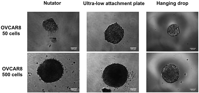 Figure 4: Phase contrast micrographs of OVCAR8 spheroids initiated with 50- or 500 cells/drop on the three platforms. Spheroids were generated on hanging drop arrays, ultra-low attachment plates or ultra-low attachment plates with a 48 hour nutation period. Scale bar = 100μm.